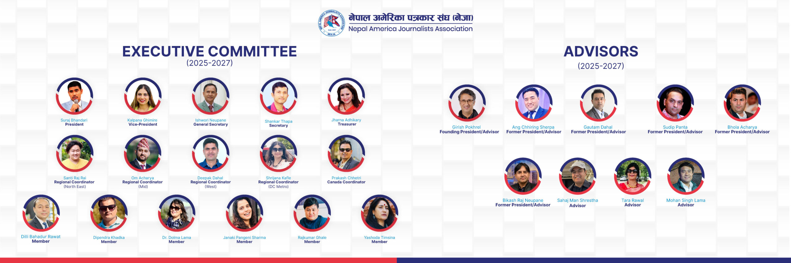 संघको आठौं अधिवेशन तथा १६औं साधारण सभाबाट बनेको यो कार्यसमिति उत्तर अमेरिकामा रहनुभएका पत्रकारहरू, जो नेपालमा रहँदा वा यहाँ आइसकेपछि पनि कहीँ न कहीँ पत्रकारितामा जोडिनुभएको छ तर नेजामा समेटिन सक्नुभएको छैन, उहाँहरू सबैलाई नेजामा आउनका लागि हार्दिक अपिल गर्दछ । त्यसका लागि यस कार्यसमितिको तर्फबाट गर्नुपर्ने पहल र व्यवस्थाका लागि कार्यसमिति सधैं तयार रहेको छ ।